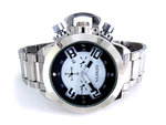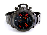Geneva XXL horloge met datumweergave, zwarte 3D wijzerplaat (chrono-look) met oranje/rode cijfers en wijzeruiteinden, roestvrijstalen band met vouwsluiting en roestvrijstalen deksel. Nikkelvrij en water resistant.